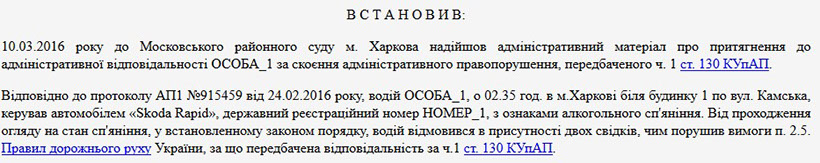 Согласно данным Реестра судебных решений, в марте 2016 года именно на таком автомобиле был остановлен гражданин Невидомый Иван Константинович с признаками состояния алкогольного опьянения, о чем составлен протокол с участием двух свидетелей. Согласно данным патрульных, водитель отказался от прохождения освидетельствования на состояние опьянения.