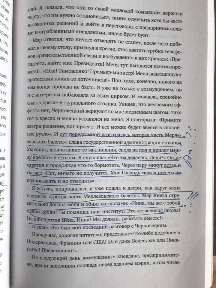 "Мэр Киева стремительно догнал меня и обнял со словами: "Инна, мы же с тобой одной крови! Ты помнишь наш институт? Это же великая школа! Не иди против меня, Инна! Мы должны работать вместе!" - подчеркнула политик.