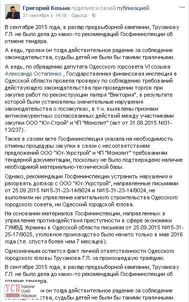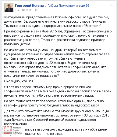 Однозначным остается факт личной ответственности одесского городского головы Труханова Г. Л. за произошедшую трагедию. Ведь, прояви он тогда действительное радение за соблюдение законодательства, судьбы детей не были бы такими трагичными, — заключил Григорий Козьма.