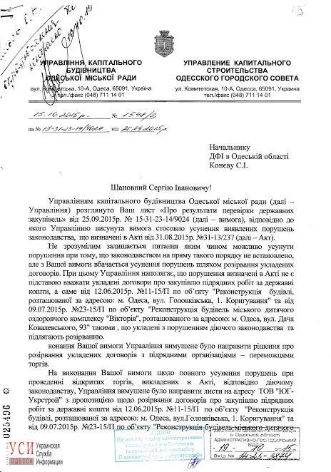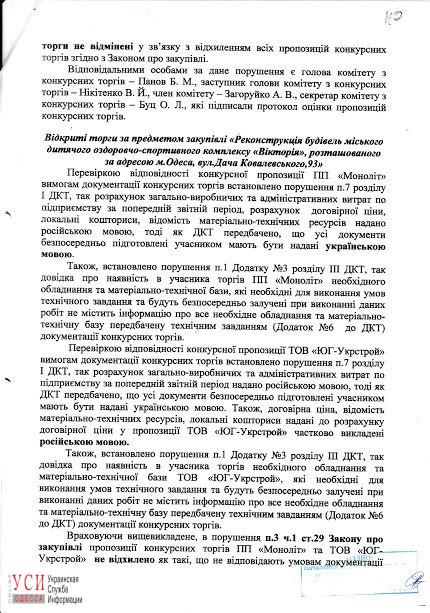 Государственная финансовая инспекция в Одесской области осенью 2015 года проверила соблюдение законодательства при проведении торгов по "Виктории". Инспекторы указали на нарушения и признаки коррупции. А именно — на связь между двумя якобы конкурирующими компаниями ООО "Юг-Строй" и ЧП "Монолит". Эти обстоятельства изложены в акте от 31.08.2015 №31-13/237.