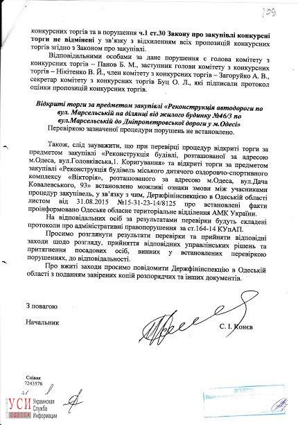 Письмо ГФИ одесскому городскому голове о результатах проверки проведенных торгов и выявленных нарушениях