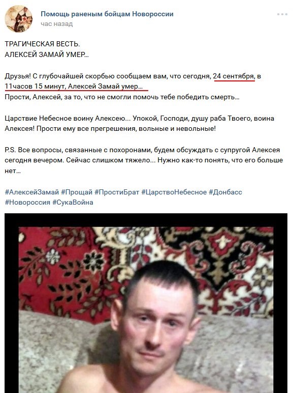 По данным блогера, 37-летний старший стрелок и сержант "республиканской гвардии ДНР" скончался 24 сентября в Донецке.