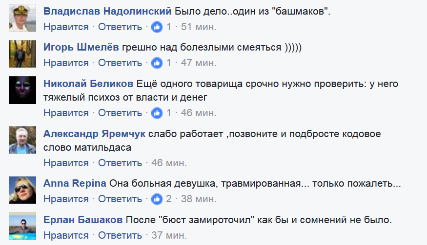 "На "головушку трахнутые" те, кто притащил ее в Госдуру, а она заслуживает награды: ни один украинец так не мстил России за оккупацию Крыма как крымский прокурор"; "Грешно над болезными смеяться"; "После "бюст замироточил" как бы и сомнений не было".