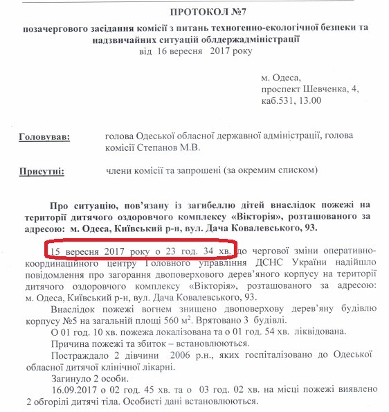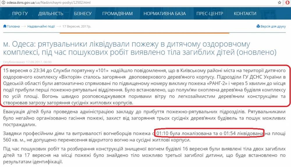 Согласно официальному протоколу заседания комиссии по ЧС при Одесской обладминистрации, звонок на "101" поступил в 23:34. Пожарные были на месте уже через пять минут. Однако из-за ненаполненного пожарного водоема, слабого напора в гидранте лагеря огонь смогли локализовать только к 01:10 16 сентября, а потушить пожар удалось спустя 44 минуты.