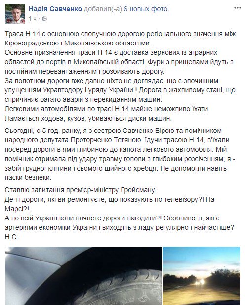 Савченко ехала по трассе "Н-14" во вторник около пяти утра 26 сентября вместе с сестрой Верой и помощником нардепа Проторченко Татьяной. Автомобиль попал в яму глубиной до капота легковой машины. В результате аварии Проторченко получила трамву головы с глубоким разсечением, сама Савченко - забой грудной клетки и шейного позвонка.