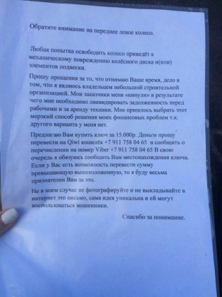 В оставленном рядом письме неизвестный предлагал купить ключ от секретки, и просил не рассказывать в интернете о его методе, поскольку: «идея уникальна, ей могут воспользоваться мошенники».