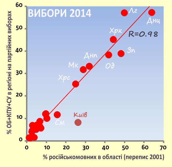 Так само, зрештою, і проукраїнськість Дацюка та тисяч російськомовних українців і росіян губиться в багатомільйонній електоральній масі, що із зашкальним коефіцієнтом кореляції 0.98 голосує в унісон зі своєю мовною свідомістю.