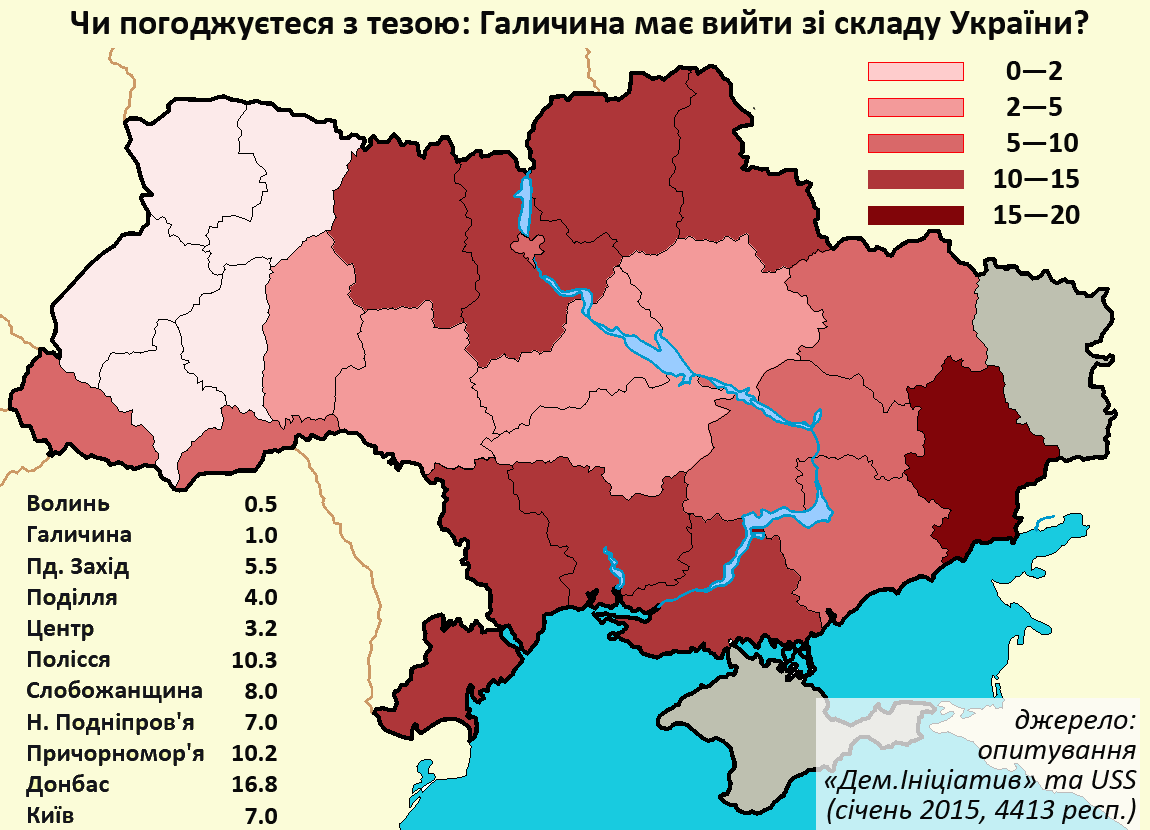 Що тут скажеш, правильно Дацюк тривожиться. Суть «галицького сепаратизму» — це сепарація від Росії, й у такому сенсі цю ідею сепаратизму нині підтримує дві третини дорослих громадян України (66,3% в опитуванні 2015 року) — кваліфікована її більшість, якщо говорити термінами процедурної демократії.