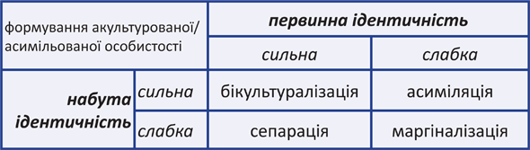 Власне асиміляція відбувається лиш при ослабленні первинної ідентичності й посиленні нової. Коли ж первинна ідентичність, у нашому випадку проросійська, залишається сильною, а українська — слабкою, відбувається сепарація (за потужної підтримки — і не тільки збройної — Росії вона реалізувалася у формі «деенер-еленер»). Але при збереженій силі обох ідентичностей вони можуть співіснувати у бікультуральній формі подвійної ідентичності. Мова перестає бути маркером несприйняття українськості.