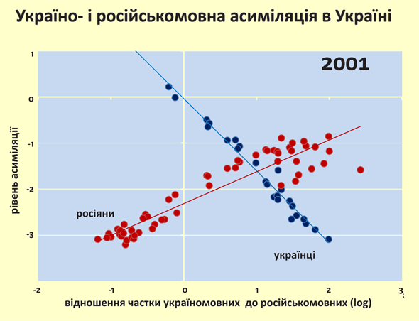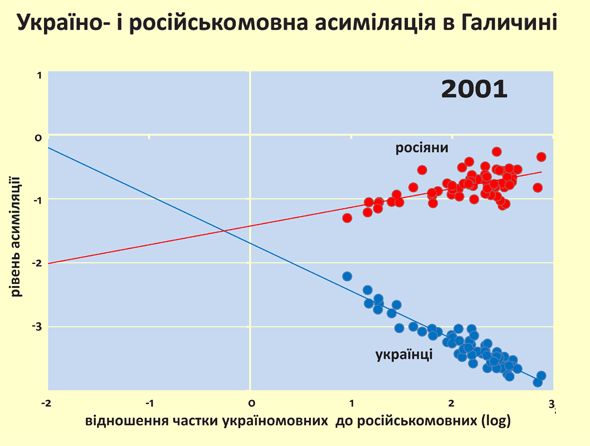 Тобто, як бачимо з діаграми, через вищий статус російської мови в Україні для однакової інтенсивності асиміляційних процесів число україномовних в реґіоні мало би переважати число російськомовних вдесятеро.