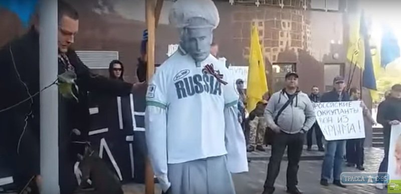 В Одессе возле консульства Российской Федерации активисты патриотических организаций повесили, а затем сожгли чучело президента России Владимира Путина.