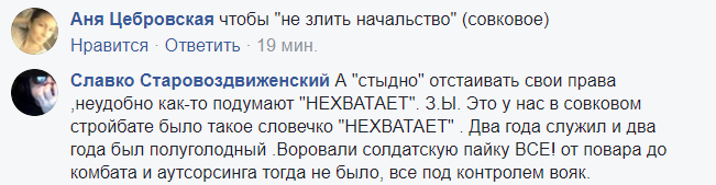 "Курсанты шли и шли, шли и шли, один за другим, один за другим. Они брали еду, брали салат, и шли есть. КАЖДЫЙ из них видел разницу. Будущие офицеры, новая генерация, многие прошли АТО, все такое. В журнале приема пищи красовалась надпись "без замечаний". Министерство обороны получило акт выполненных работ "без замечаний". Министерство выплатило положенные деньги фирме-аутсорсеру. К объему средств замечаний тоже не было", - добавил он.