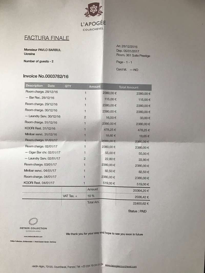 В добавок ко всему, в нашу редакцию прислали счет, который был оплачен Павлом Барбулов в отеле в фешенебельном курорте Куршавель 1850 в период новогодних праздников 2016/2017.