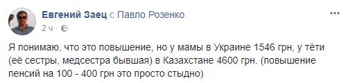 Евгений Заец, журналист: "Я понимаю, что это повышение, но у мамы в Украине 1546 грн, у тёти (её сестры, медсестра бывшая) в Казахстане 4600 грн. Повышение пенсий на 100 - 400 грн это просто стыдно".
