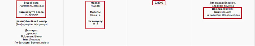 Серед задекларованих автомобілів у прокурорській родині є лише Hyundai Santa Fe 2012 року випуску, придбаний у тому ж році, який належить дружині Людмилі Володимирівні. Вказана в декларації вартість авто – 321 тис. грн.