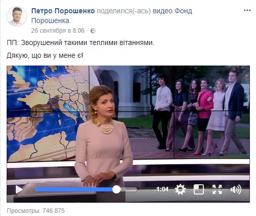 На прошлой неделе, 26 сентября мир увидел ролик-поздравление президенту Порошенко от его семьи. В виде выпуска экстренных новостей, где первая леди Марина Порошенко - диктор, а дети президента - герои сюжетов, в которых они поздравляют отца.