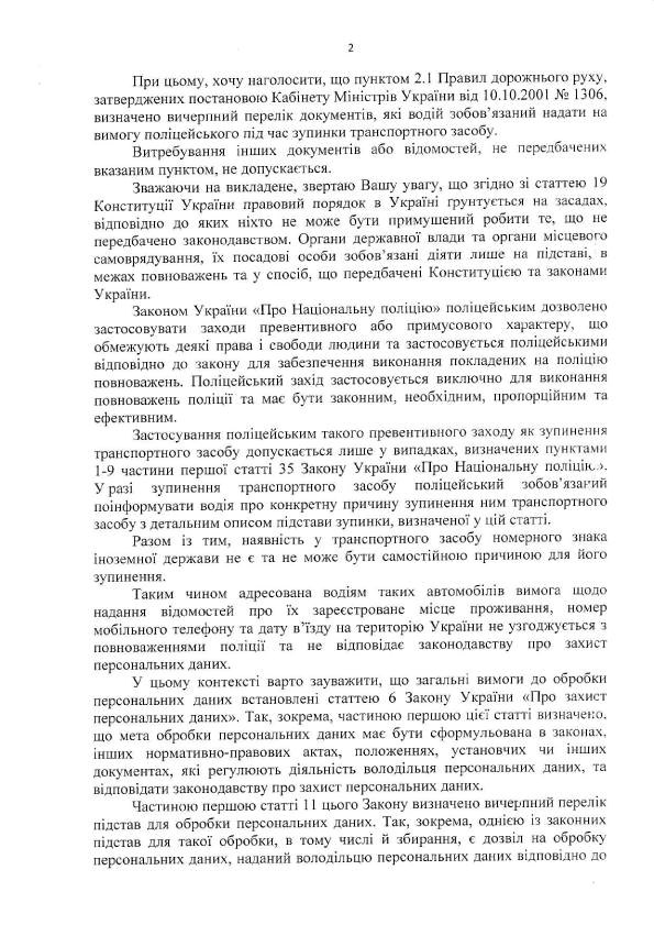 "Учитывая указанное, незаконный сбор органами Национальной полиции информации о владельцах (водителей) транспортных средств с иностранной регистрацией, которые находятся на территории Украины, в рамках проведения совместной специальной пограничной операции "Граница-2017" должен быть прекращен, а собранная информация - уничтожена в связи с нарушением требований Закона Украины "О защите персональных данных". О принятых мерах прошу проинформировать меня в месячный срок", - говорится в обращении.