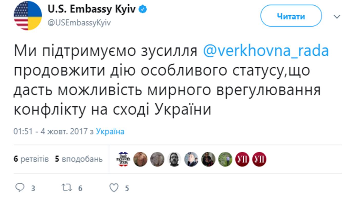 Вероятно, чтобы облегчить депутатам принятие этого решения, посольство США в Украине публично поддержало "усилия Верховной Рады продлить действие особого статуса, что даст возможность мирного урегулирования конфликта на востоке Украины", о чем говорится в сообщении в Твиттере.