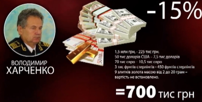Один из тех, кто таким образом может пополнить бюджет страны – экс-ректор НАУ Владимир Харченко. Ему угрожает лишение свободы сроком 12 лет с конфискацией за то, что он пытался за взятку в 172 тысячи евро восстановить в должностях уволенных проректоров. Хотя сам Харченко утверждает, что он взяток не брал, а его имя использовали. Тем не менее, налог на эту взятку Харченко вряд ли уплатит, так как все деньги изъяли при задержании. Но ему придется поделится с государством суммой в 5 миллионов гривен, которую нашли в его доме. Если прокуроры докажут незаконное происхождение этой суммы, Харченко должен будет уплатить 15% от этих денег – это около 700 тысяч гривен.