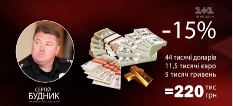 Начальник департамента службы охраны Сергей Будник в августе 2017 года был задержан при получении взятки в 96 тысяч гривен, а во время обыска в его доме было изъято 44 тысячи долларов, 11,5 тысяч евро и 5 тысяч гривен. Если докажут незаконность происхождения этих денег, Будник заплатит около 200 тысяч гривен налога, то есть 15% от найденной суммы.