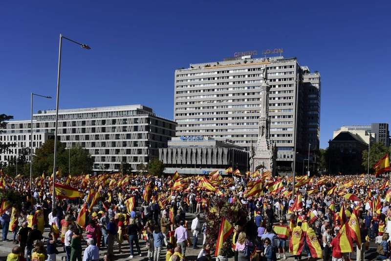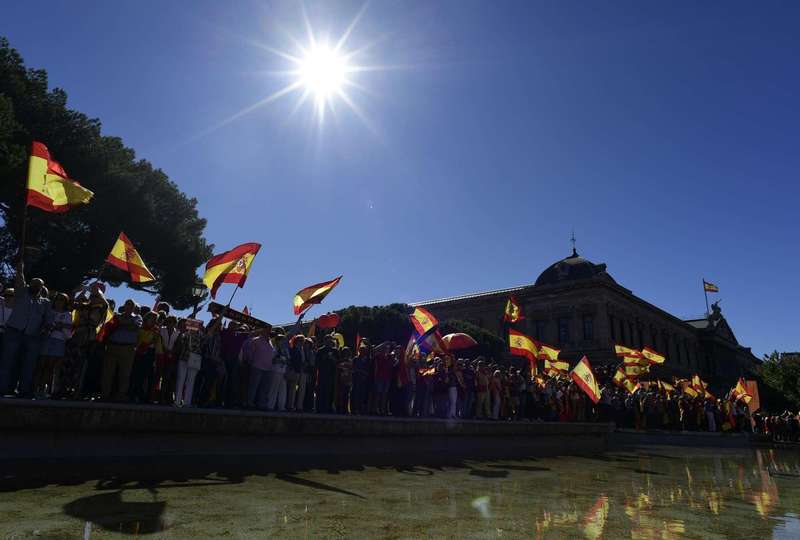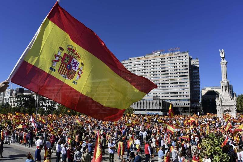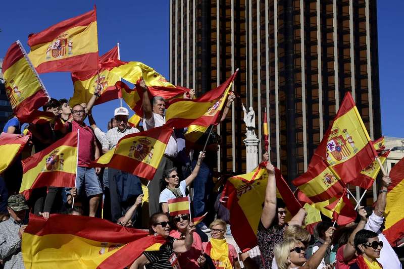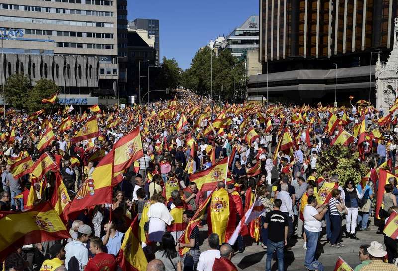 На мадридской площади Пласа де Колон собираются сотни тысяч граждан, которые держат в руках национальные флаги и плакаты с призывом не допустить раскола Испании.