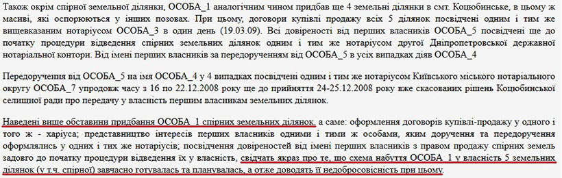 Из судебных решений узнаем, что эти земли были приобретены незаконно. Сейчас государство пытается забрать у прокурора земельные участки и уже выиграло целый ряд споров. Интересно, что судами прямо установлено, что приобретатель этих земель, то есть Никита Ильин, действовал недобросовестно. Например, в решении Ирпенского городского суда говорится, что прокурор обязан был знать о незаконности отвода земли и, вообще, приобретение в собственность земли в Коцюбинском «заблаговременно готовилось и планировалось, а следовательно, это доказывает его недобросовестность при этом».