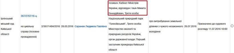 В реестре прав на недвижимое имущество эти земельные участки отсутствуют, но о них и истории их приобретения может рассказать Реестр судебных решений. Именно из него становится известно, что речь идет о землях национального природного парка «Голосеевский» у Коцюбинского.