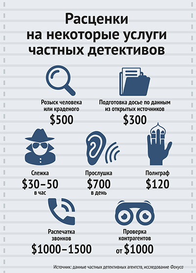 Одна из самых востребованных услуг — наружное наблюдение. Её заказ не вызывает затруднений. "Выделяем экипаж (машина и два человека), наблюдение ведём до двери, — заявили Фокусу в одном из столичных детективных агентств. — Только в суде эти данные использовать не получится, разве что кто-то из ваших знакомых заявит, что сам видел и снял". За слежку частные детективы требуют порядка $30–50 в час.