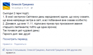 По нынешней активности Алексея Гриценко в Фейсбуке видно, что интернет-связь в месте его службы надежна и стабильна, как помощь волонтеров украинской армии. В день Гриценко-младший по три-четыре раза обновляет свой статус. А 18 ноября он сообщил, что 11 ноября был подписан приказ о присвоении ему очередного звания — старшего лейтенанта.