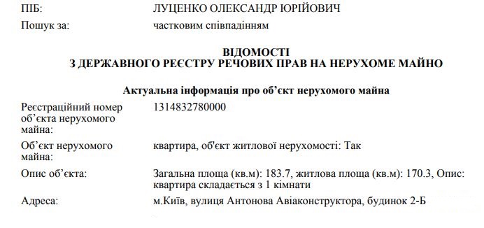 Согласно выписке из Государственного реестра прав на недвижимое имущество, 1 августа 2017 года Александр Луценко стал собственников квартиры общей площадью 183, 7 кв.м. (жилая из них - 170,3 кв.м). В документе уточняется, что это однокомнатные апартаменты. По указанному адресу находится новый элитный 24-этажный ЖК "Шервуд" с видом на лес.