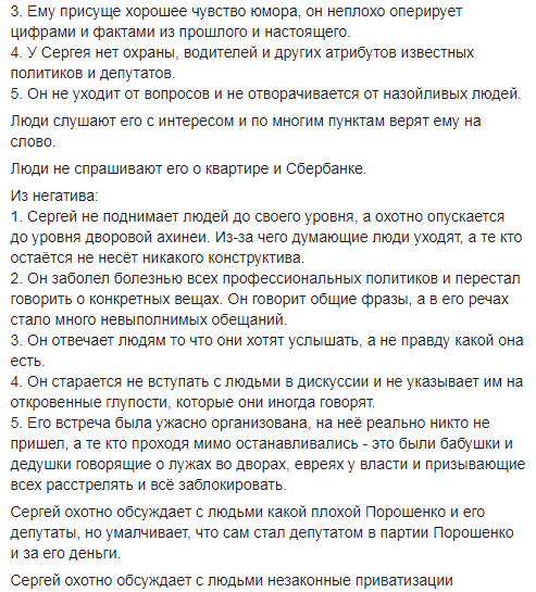 "Сергей охотно обсуждает с людьми какой плохой Порошенко и его депутаты, но умалчивает, что сам стал депутатом в партии Порошенко и за его деньги. Сергей охотно обсуждает с людьми незаконные приватизации Ахметова, но на вопрос про аналогичные приватизации Пинчука делает круглые глаза", - пишет блогер.