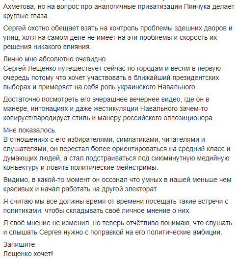 Он считает, что Лещенко хочет участвовать в президентских выборах и "примеряет на себя роль украинского Навального".