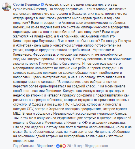 "Алексей, спорить с вами смысла нет, это ваш субъективный взгляд. По поводу популизма. Если я говорю, что пенсия маленькая, потому что мало денег в бюджете, а их мало, потому что их оттуда крадут в масштабах десятков миллиардов гривен в год - это популизм?" - заявил нардеп.