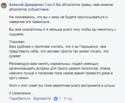 "В какой-то момент мне показалось, что его оппонирование власти из профессиональной позиции превратилось в позу и навязчивую идею, а его желание любой ценой сместить Порошенко связано не с благом для Украины, а с желанием самому сесть в это кресло", - считает блогер.