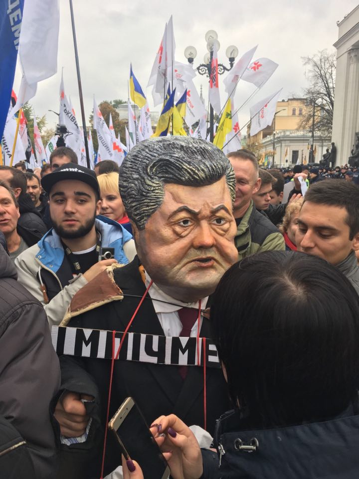 Сегодня, 17 октября, в толпе митингующих активистов под Верховной Радой появился человек в маске президента Петра Порошенко.