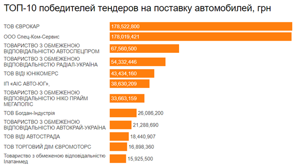 Кому достаются самые «жирные» заказы? Первые два места с большим отрывом от конкурентов заняли завод «Еврокар» и киевская фирма «Спец-Ком-Сервис» с общим уловом на каждого в районе 180 млн грн. Первая компания принадлежит Олегу Боярину, завод которого расположен в Закарпатье недалеко от венгерской границы. С 2001 года здесь собирают автомобили Skoda. Мощность завода — 100 тыс. машин в год, но в последние годы он был загружен менее чем на 10%. Впрочем, даже это позволяет предприятию оставаться крупнейшим производителем машин в стране — в сентябре этого года завод произвел 515 легковых авто, или почти 75% от их общего объема выпуска в Украине.