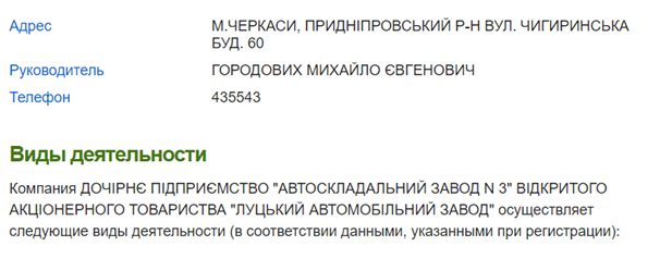 Сама указанная компания принадлежит на паритетных началах ее директору Сергею Калюшу и Михаилу Городовых. Последний известен в качестве экс-главы «Автосборочного завода №3» (черкасский филиал Луцкого автосборочного завода, принадлежащего корпорации «Богдан»). Как известно, ранее основным собственником «Богдана» был президент Украины Петр Порошенко, продавший его в итоге своему давнему бизнес-партнеру Олегу Олег Гладковскому (Свинарчуку), который после избрания Порошенко президентом стал первым заместителем секретаря СНБО и куратором оборонного комплекса.