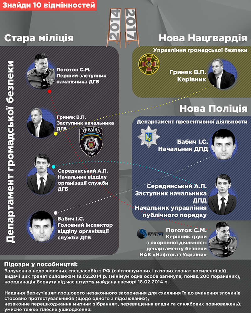 Именно в этот момент в истории появляются двое других подозреваемых - Анатолий Серединский и Игорь Бабич. Серединский по состоянию на 2014 год занимает должность с длинным названием «начальник отдела организации службы управления организации службы, работы конвойных подразделений специальных учреждений и судебной милиции Департамента общественной безопасности Министерства внутренних дел». Бабич работал в том же департаменте в должности с не менее длинным названием «главный инспектор отдела организации службы управления организации службы, работы конвойных подразделений, специальных учреждений и судебной милиции». Сейчас оба служат в Национальной полиции. Бабич - глава Департамента превентивной деятельности, Серединский - его заместитель. Оба связаны с фигурой другого подозреваемого в причастности к разгону Майдана - генерала Владимира Гриняка. Во время Майдана Гриняк возглавляет управление общественной безопасности МВД и является руководителем обоих нынешних полицейских.