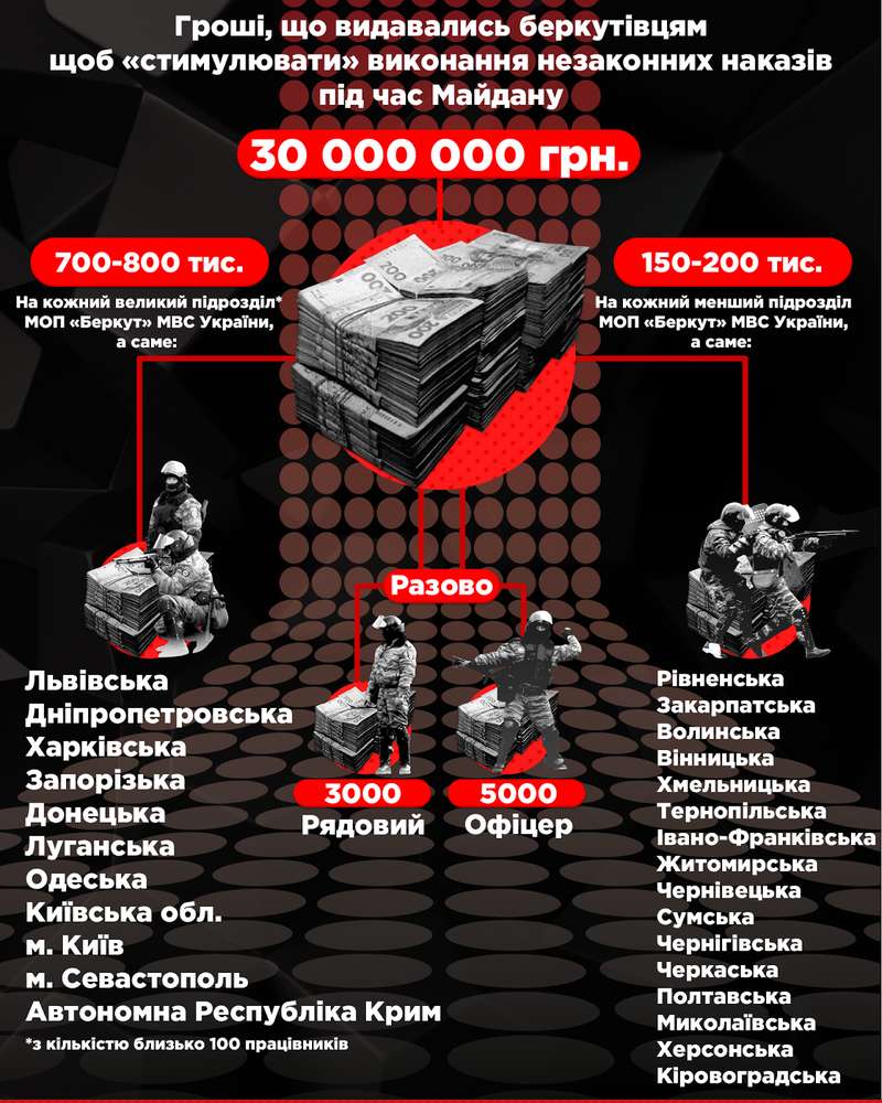 В материалах подозрения именно по Серединскому есть еще один эпизод, который состоялся в декабре 2013 года. По мнению следствия, кроме непосредственно насильственных действий против митингующих с использованием «титушек» и новым силовым разгоном, план тогдашней власти содержал еще и «поощрительную» часть. Для материального стимулирования «беркутовцев» выделяют не менее 30 млн грн. Кто конкретно дал эти средства - неизвестно. По мнению следствия, Серединский вместе с Гриняком непосредственно осуществляли распределение денег для нужд «Беркута». Это якобы происходило в помещении МВД на улице Богомольца и выглядело так: сначала деньги раскладывали в полиэтиленовые пакеты с указанием названия одного из 27 региональных подразделений «Беркута». Суммы выделяли из расчета 700-800 тыс. грн в крупное подразделение «Беркута», где работали около 100 работников в каждом. На меньшие подразделения выделили 150-200 тыс. грн (подробнее в инфографике). Эти средства в кабинете Гриняка получали руководители или заместители руководителей региональных подразделений. Потом уже они делили деньги между личным составом из расчета 5 тыс. грн на офицера и 3 тыс. грн на рядового.