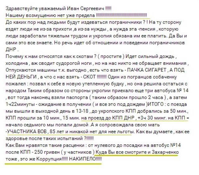 «Почему к нам относятся как к скотам?» — возмущается поклонница"ДНР». По словам автора, боевики в первую очередь пропускают машины, в которых могут чем-то поживиться. «Пачка сигарет, а под ней деньги, а что с нас взять, — скот!» — ругается выезжающая в «укропию».