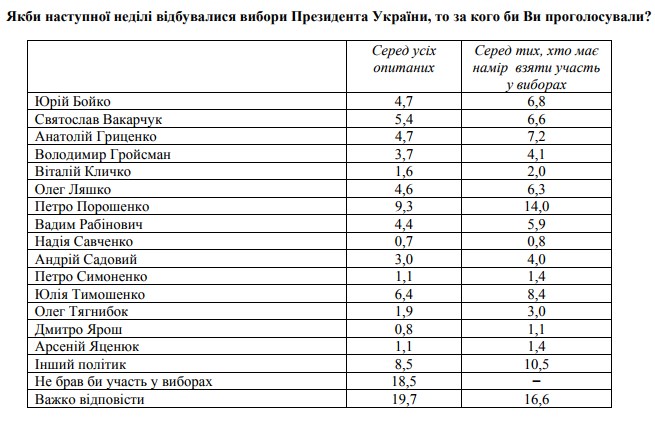 За Вадима Рабиновича готовы отдать свой голос 5,9% участников выборов, Владимир Гройсман - 4,1%, за Андрея Садового - 4,0%, за Олега Тягнибока - 3,0%, за Виталия Кличко - 2,0%, по Арсения Яценюка - 1,4%, за Петра Симоненко - 1,4%, за Дмитрия Яроша - 1,1%, за Надежду Савченко - 0,8%.