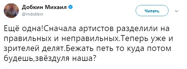 Но этого ему показалось мало и он разразился гневным постом у себя в Twitter. "Еще одна! Сначала артистов разделили на правильных и неправильных.Теперь уже и зрителей делят. Бежать петь то куда потом будешь, звездуля наша?" - написал депутат.