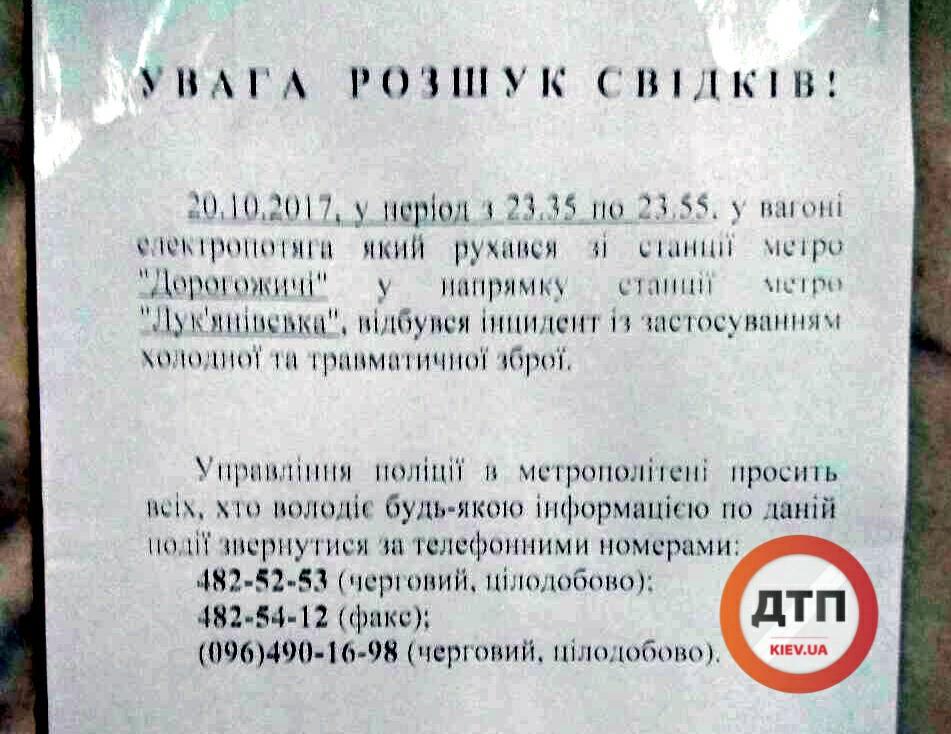 Инцидент произошел еще 20 октября на станции метро «Дорогожичи». Двое парней, бывшие участники АТО с позывными «Адик» и «Десантура» зайдя в вагон, увидели «барыгу», с которым ранее конфликтовали. Последний сразу напал на бойцов и начал наносить удары ножом.