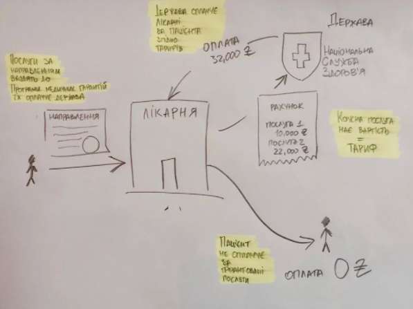 В подтверждение своих слов замминистра рисует схему. На ней пациент идет в больницу. больница выставляет счет за оказанные пациенту услуги новому органу - Национальной службе здоровья. А НСЗ возвращает больнице потраченные на пациента средства. "Каждая услуга имеет цену = тариф. Пациент не оплачивает услуги", - пишет замминистра.