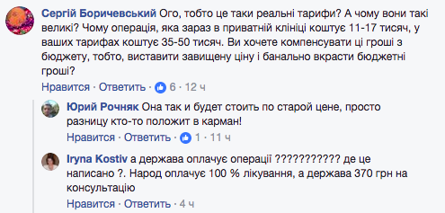 "То есть, это таки реальные тарифы? А почему они такие большие? Почему операция, которая сейчас в частной клинике стоит 11-17 тысяч, в ваших тарифах стоит 35-50 тысяч. Вы хотите компенсировать эти деньги из бюджета, то есть, выставить завышенные цены и банально украсть бюджетные деньги?" - пишет один из комментаторов чиновнику. Пользователи приводят примеры.