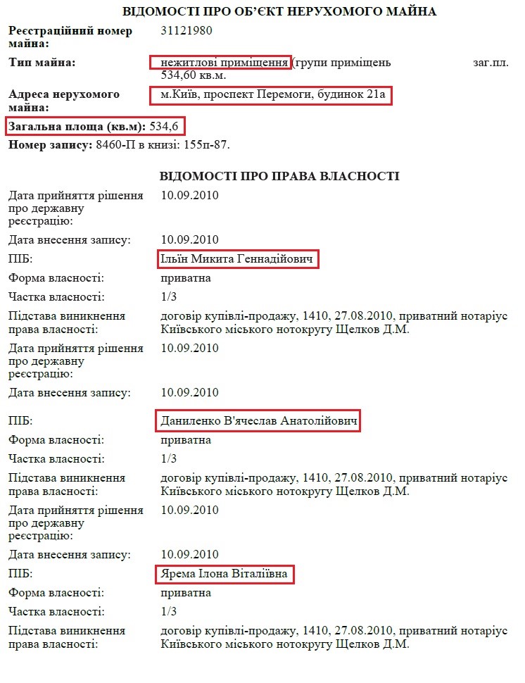 Також у 2016 році стало відомо, що донька колишнього генпрокурора Віталія Яреми 27 серпня 2010 року купила приміщення на проспекті Перемоги, 21-А в Києві. Тоді їй виповнилося 18 років. Ці приміщення у 2008-2009 рр. з аукціону купило ТОВ «Бізнессофт Груп». Об’єкт було придбано за 2,92 млн грн., тобто по 7 тис грн./м². Власниками цієї компанії були Микита та Євгеній Ільїни – син-прокурор і племінник екс-депутата Київради Геннадія Ільїна. У 2010 році приватизовані приміщення площею 535 м² через договори купівлі-продажу були оформлені на нових власників. Одну третину отримав Микита Ільїн. Також частку приміщень отримав син Анатолія Даниленка – В’ячеслав ще одну третину купила донька екс-генпрокурора Ілона Ярема.