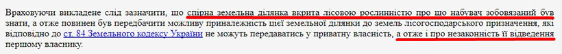 З судових рішень дізнаємось, що ці землі були набуті незаконно. Наразі держава намагається забрати у прокурора земельні ділянки і вже виграла цілий ряд спорів. Цікаво, що судами прямо встановлено, що набувач цих земель, тобто Микита Ільїн, діяв недобросовісно. Наприклад, у рішенні Ірпінського міського суду йдеться, що прокурор зобов’язаний був знати про незаконність відведення землі і, взагалі, набуття у власність землі в Коцюбинському «завчасно готувалась та планувалась, а отже, доводять її недобросовісність при цьому».