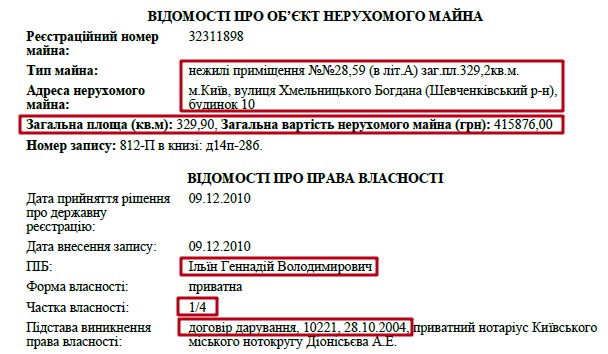 Є у власності Генадія Ільїна і ¼ нежитлових приміщення по вулиці Богдана Хмельницького, 10, їх площа 329 м², а вказана вартість – 415 тис. грн. Також він володіє приміщенням на Львівській площі, 8-А, в скандальному торговому центрі до будівництва якого він також причетний.