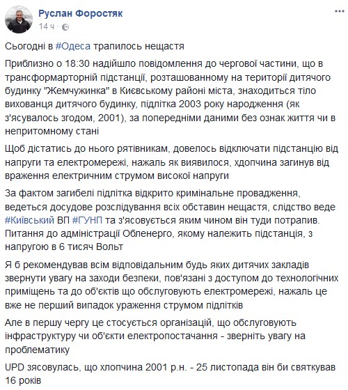 В Одессе воспитанник детского дома "Жемчужинка" залез в трансформаторную будку и погиб от удара электрическим током. Об этом сообщает советник начальника одесской полиции Руслан Форостяк на своей странице в Facebook.