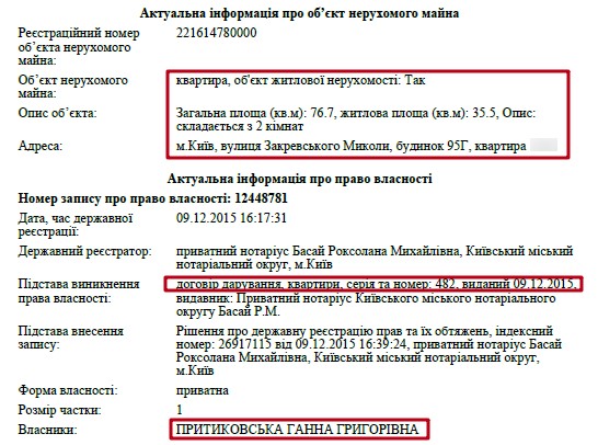 Среди недвижимого имущества в собственности Анны Григорьевны находится квартира площадью 76 м² в Киеве, по адресу ул. Закревского, 95-Г. По нашей информации, ранее этой квартирой владел лично прокурор Владимир Комашко. Стоимость подобного жилья сегодня — ок. 65 тыс. долл.